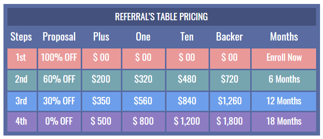 In this table, you can see the four steps of our discount process for all plans. In our proposal, you start with 90% OFF and end up paying the actual price in the 18th month.